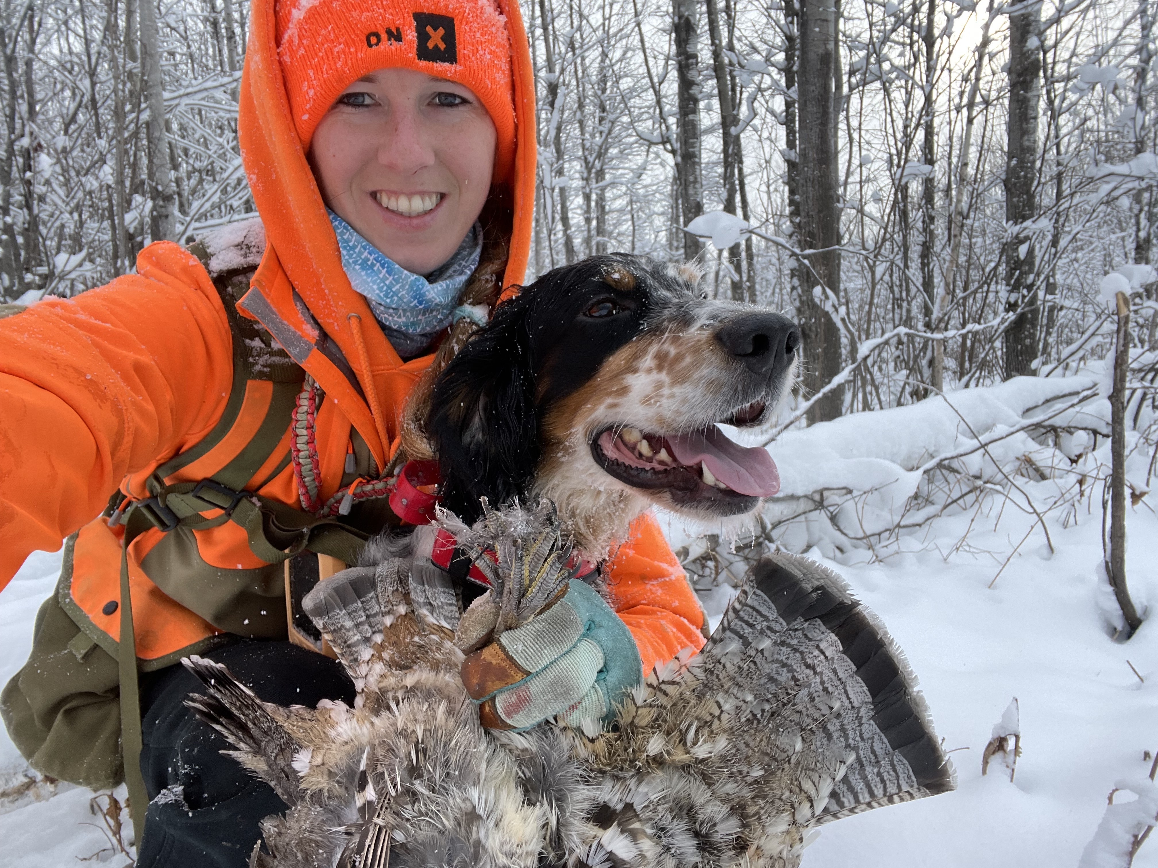 Julie Sandstrom, 53, of Grand Rapids, Minn., shown here with two of her dogs, Titan and Roxie, has been around hunting dogs her entire life. Now the national chairperson of the Ruffed Grouse Society and American Woodcock Society, she started bird hunting when she was 19. (Provided by Julie Sandstrom)