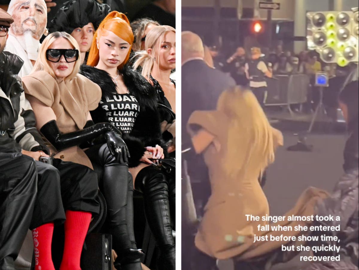 Madonna stumbled as she walked in high heels during a rare New York Fashion Week appearance.